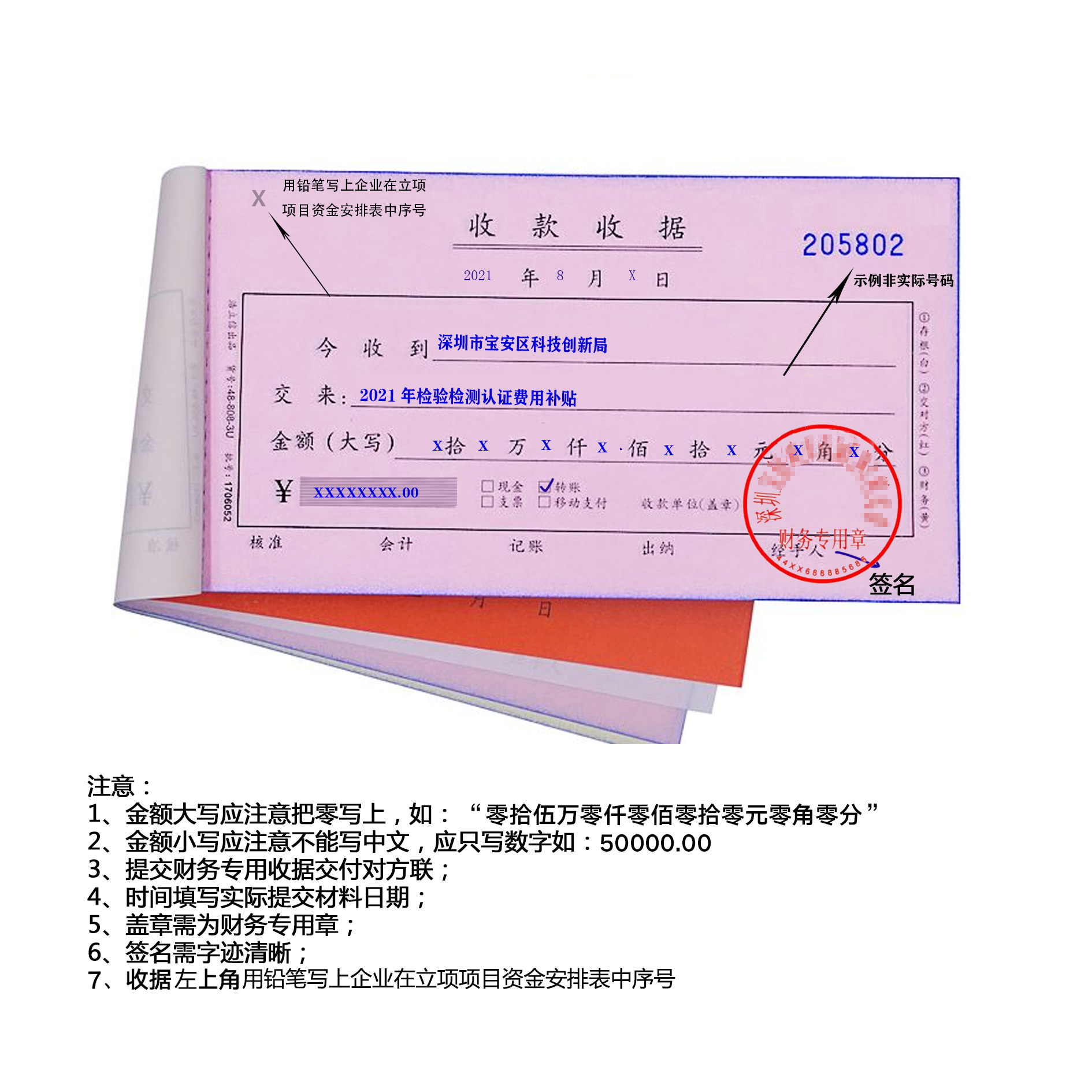 區(qū)科技創(chuàng)新局將按規(guī)定辦理資金撥付手續(xù)。撥付資金需企業(yè)開具收據(jù),請(qǐng)各有關(guān)企業(yè)于8月9日前將收據(jù)郵寄至深圳市寶安區(qū)科技創(chuàng)新服務(wù)中心,有關(guān)開立收據(jù)事項(xiàng)如下:
