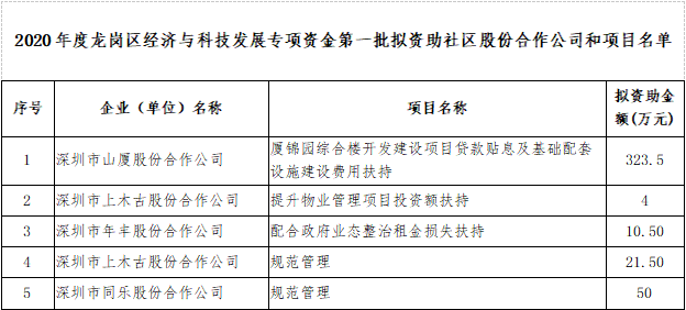現將2020年度龍崗區經濟與科技發展專項資金擬資助第一批社區股份合作公司和項目在龍崗區政府在線公示,向社會各界廣泛征求意見。