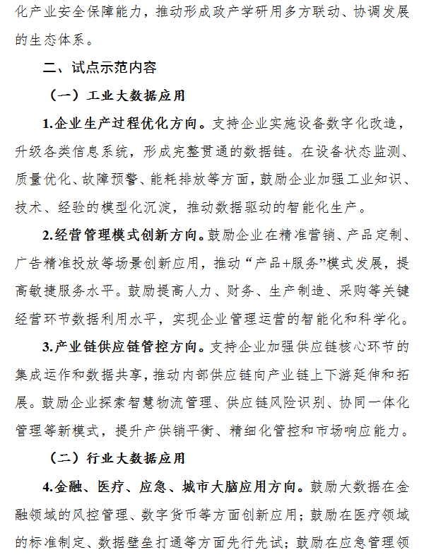 本次申報圍繞工業大數據應用、行業大數據應用、大數據重點產品、數據管理及服務四個方向,征集并遴選一批大數據產業試點示范項目,通過試點先行、示范引領,總結推廣可復制的經驗做法,推進大數據產業高質量發展。申報指南詳見附件。
